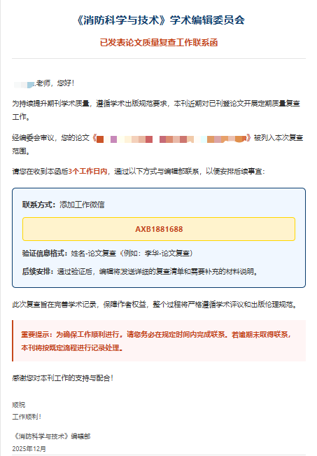 近期本刊发现有不法分子冒充《消防科学与技术》编辑部,以“论文质量复查”等名义向作者发送虚假联系函,诱导添加非官方联系方式,存在诈骗风险。示例如下: